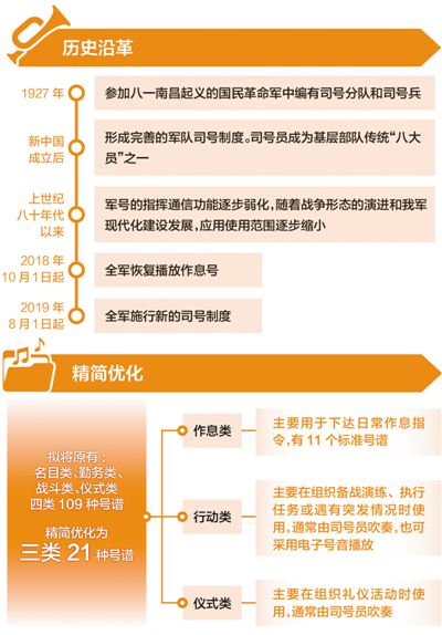 “民眾對行動號、儀式號的設置很關注,新的司號制度充分考慮了繼承與創新的關系。因此,一部分曾經激勵過一代代革命軍人的歷史號譜,作為人民軍隊的寶貴財富,將被傳承保留下來。”陳零表示,這次恢復和完善工作主要是對軍號功能類別和使用管理進行相應規范和調整。