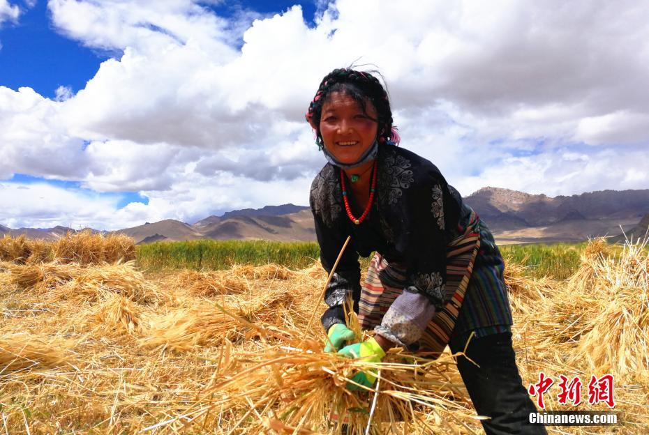 青稞作為青藏高原特有的糧食作物,是西藏種植面積最大、產量占糧食作物比重最高的農作物。進入9月,西藏也將迎來首個“中國農民豐收節(jié)”,2018年,西藏青稞的總種植面積將增至211萬畝,產量將突破80萬噸。圖為9月12日,日喀則市定日縣扎果鄉(xiāng)的農牧民次仁曲珍在地里收青稞。 中新社記者 趙延 攝?