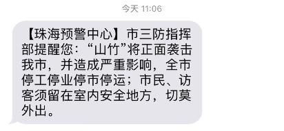 廣東珠海市民收到了來自珠海預警中心的短信:“切莫外出。”