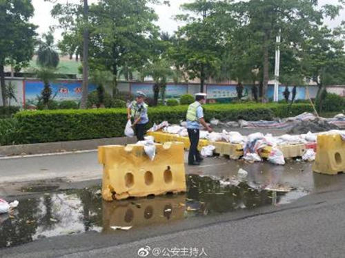 ▲面對超強臺風“山竹”正面襲擊南粵,全省交警部門提高勤務響應等級,加強值班備勤與警力部署,警力全員在崗在位。臺風來臨之際,交警門正在搬運沙袋、清理路面。
