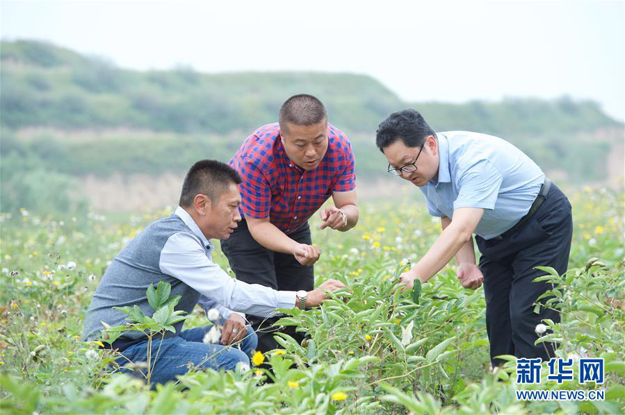 來(lái)自福建長(zhǎng)樂(lè)的林錦云(中)在寧夏固原市河川鄉(xiāng)與福建對(duì)口支援農(nóng)業(yè)專家(右)交流牡丹種植技術(shù)(8月28日攝)。2014年,林錦云通過(guò)土地流轉(zhuǎn)方式,承包了河川鄉(xiāng)1.5萬(wàn)畝荒山,打造油用牡丹生產(chǎn)基地。目前,林錦云種下的7600畝油用牡丹已經(jīng)開(kāi)始產(chǎn)生效益,公司已就近吸納村民300多人就業(yè),其中建檔立卡貧困戶39戶,人均年收入2萬(wàn)多元。? 新華社記者姜克紅攝