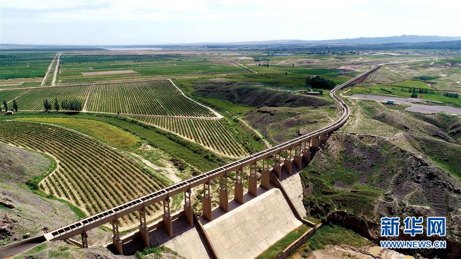 這是寧夏固海揚(yáng)水工程長(zhǎng)山頭渡槽(9月6日無(wú)人機(jī)拍攝)。? 新華社記者王鵬攝