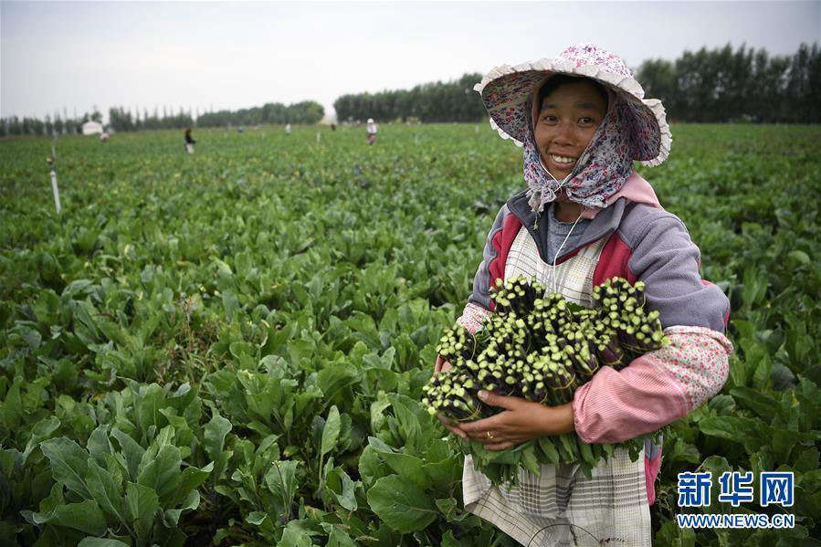 在固原市原州區(qū)彭堡鎮(zhèn)姚磨村,村民在蔬菜基地收獲蔬菜(8月27日攝)。? 新華社記者王鵬攝