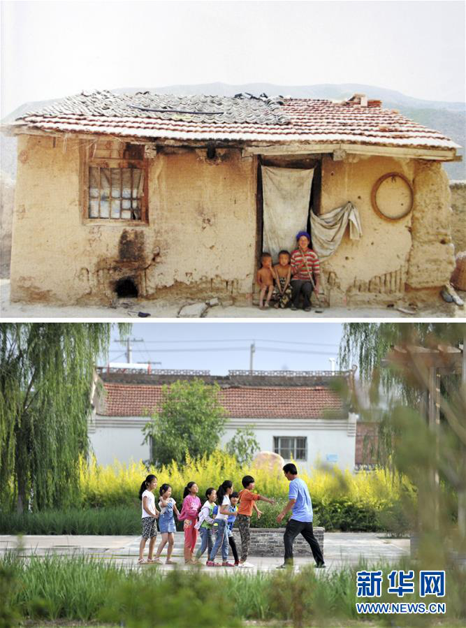 拼版照片:上圖為寧夏銀川市永寧縣閩寧鎮(zhèn)建設(shè)初期簡(jiǎn)易的土坯房(資料照片);下圖為8月17日,孩子們?cè)陂}寧鎮(zhèn)原隆村一休閑廣場(chǎng)上玩耍(新華社記者劉軍喜攝)。? 新華社發(fā)