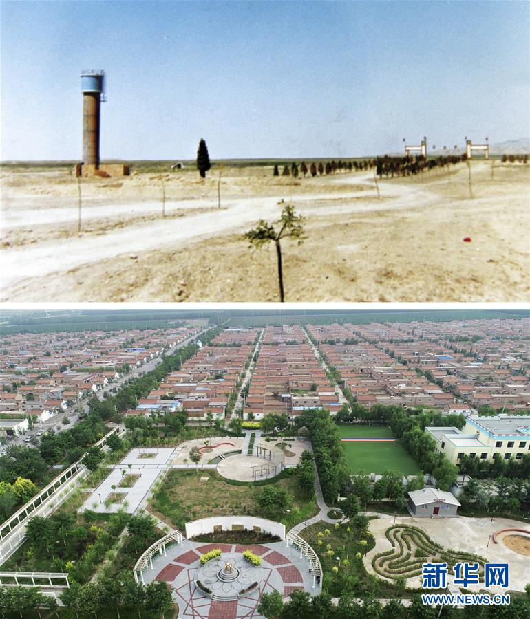 拼版照片:上圖為寧夏銀川市永寧縣閩寧鎮(zhèn)建設(shè)初期的資料照片;下圖為8月17日無(wú)人機(jī)拍攝的寧夏銀川市永寧縣閩寧鎮(zhèn)原隆村(新華社記者王鵬攝)。受益于福建、寧夏多層次、多形式、寬領(lǐng)域、全方位的扶貧協(xié)作,閩寧鎮(zhèn)這片曾經(jīng)的戈壁荒灘,被建設(shè)成現(xiàn)代化的生態(tài)移民示范鎮(zhèn)。6萬(wàn)多名曾經(jīng)生活在西海固貧困山區(qū)的農(nóng)民陸續(xù)走出大山搬入閩寧鎮(zhèn),通過(guò)移民搬遷走上了脫貧致富之路。 新華社發(fā)