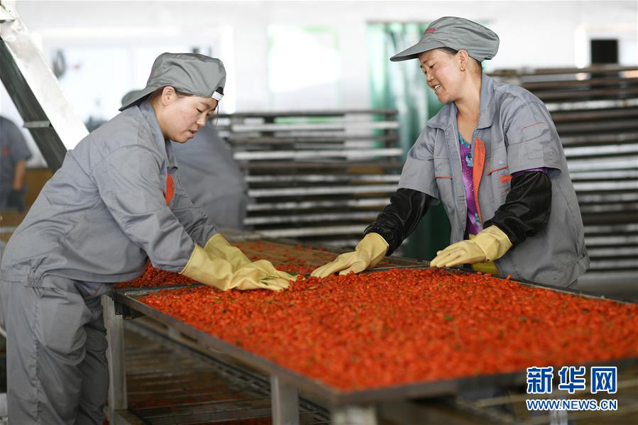 在寧夏同心縣潤(rùn)德莊園枸杞基地,工人在清洗鮮枸杞(6月22日攝)。? 新華社記者王鵬攝