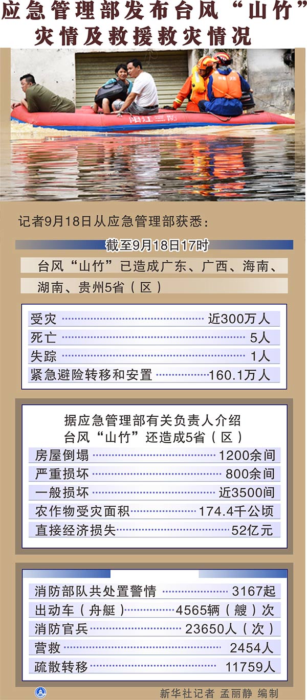 新華社北京9月18日電(記者葉昊鳴)記者18日從應急管理部獲悉,截至18日17時,臺風“山竹”已造成廣東、廣西、海南、湖南、貴州5?。▍^)近300萬人受災,5人死亡,1人失蹤,160.1萬人緊急避險轉移和安置。