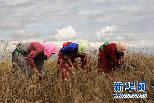 海南藏族自治州共和縣塘格木鎮吾赫勒村村民在收割青稞(9月26日攝)。 時下正值青海省海南藏族自治州青稞收獲季,當地農民搶抓農時進行收割,田間一派繁忙景象。 新華社記者 趙玉和 攝