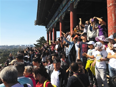 10月2日,景山公園內(nèi),游客在萬(wàn)春亭眺望故宮全景。 新京報(bào)記者 王飛 攝