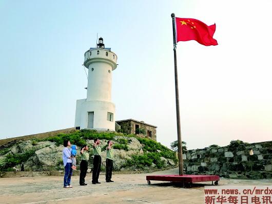2017年9月12日,王志國(右一)一家與父母在開山島上向國旗敬禮。新華社發(謝明明攝)