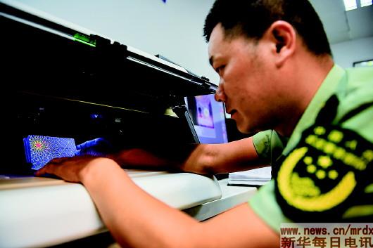 2018年8月7日,在位于南京祿口國際機場內的南京邊防檢查站證件研究中心,王志國利用文檢設備進行證件研究。