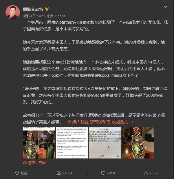 9月24日,知名旅游博主“假裝文森特”在微博發文稱,同事的伴侶凱特在澳大利亞的白天堂沙灘希爾灣撿到了一個來自印度洋的漂流瓶,瓶子里面有張紙條,是個中國船員寫的。信里道出了對未婚妻的無盡思念:“我是一名海員,現在正在印度洋上正在航行,心里很思念家中的未婚妻,剛訂婚不久我就出海了,心里感覺很對不起她,借著漂流瓶把心中的話寫出來。希望我回去以后,能跟晨靜和和美美,長長久久,其實呢,瓶子在深海中,也不奢侈有人能撿到打開,只是求一個心里的安慰。”因此,凱特非常希望能找到信中提到的未婚妻晨靜,告訴她她有一個多么棒的未婚夫。