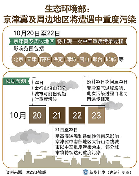 新華社北京10月19日電(記者高敬)記者從生態(tài)環(huán)境部獲悉,10月20日至22日,京津冀及周邊地區(qū)將出現(xiàn)一次中至重度污染過程,影響范圍包括北京、天津、石家莊、保定、廊坊、唐山、邢臺(tái)和邯鄲市等。