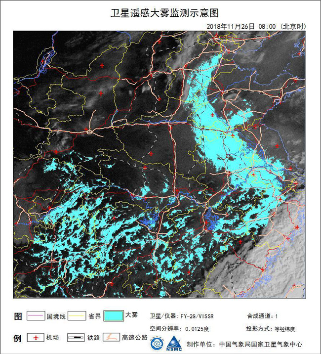 圖為FY-2G氣象衛(wèi)星大霧監(jiān)測(cè)示意圖像 2018年11月26日08:00(北京時(shí))