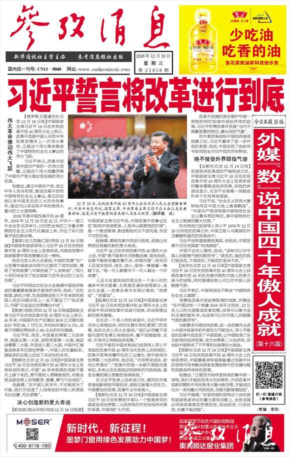 《參考消息》頭版報(bào)道改革開放40周年紀(jì)念大會 彩版
