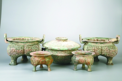 3號大墓的獨特之處在于,槨室四壁共有9個壁龕,每龕有1年輕女性殉葬。出土文物中有2件鑄有“芮公”的銅鼎、5镈9鈕的編鐘、大量的車馬器及1件罕見的木格漆繪墻圍與1件漆器。這座墓中未發現任何兵器,由此推測墓主可能為2號墓主人芮公的夫人。