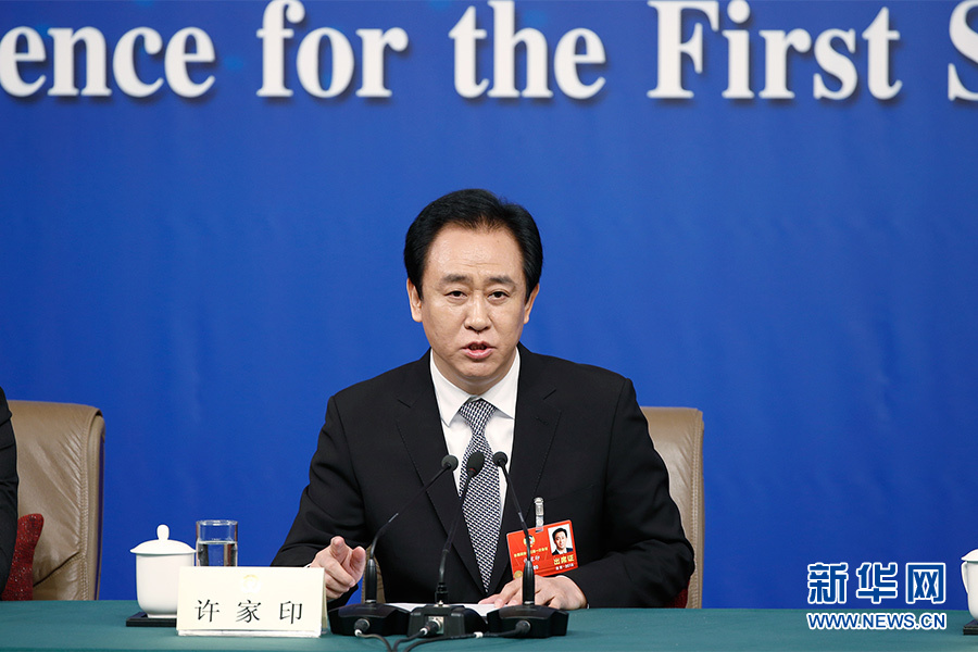 3月10日8時45分,全國政協十三屆一次會議在梅地亞中心多功能廳舉行記者會,邀請5位全國政協委員就“提高保障和改善民生水平”回答記者提問。圖為許家印回答記者提問。新華網/中國政府網 翟子赫 攝