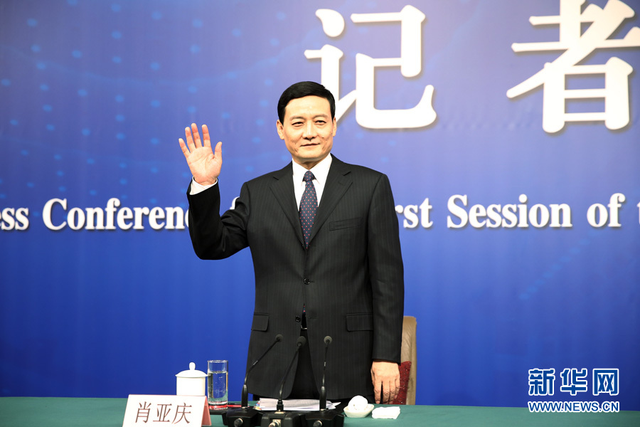 十三屆全國(guó)人大一次會(huì)議新聞中心3月10日15時(shí)在梅地亞中心多功能廳舉行記者會(huì),邀請(qǐng)國(guó)務(wù)院國(guó)資委主任肖亞慶,副秘書長(zhǎng)、新聞發(fā)言人彭華崗就“國(guó)有企業(yè)改革發(fā)展”相關(guān)問題回答中外記者提問。圖為肖亞慶向記者示意。新華網(wǎng)/中國(guó)政府網(wǎng) 翟子赫 攝