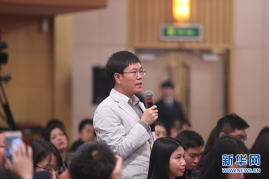 3月12日,十三屆全國人大一次會議新聞中心在梅地亞中心多功能廳舉行記者會,邀請十二屆全國人大內司委副主任委員王勝明、財經委副主任委員烏日圖、教科文衛委副主任委員吳恒、環資委委員呂彩霞,全國人大常委會法工委副主任王超英、副主任許安標就“人大立法工作”相關問題回答中外記者提問。圖為瞭望周刊記者提問。新華網/中國政府網 翟子赫 攝
