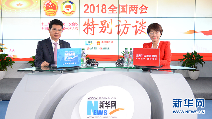 3月14日,全國政協(xié)委員、蘇寧環(huán)球董事長(zhǎng)張桂平(左)做客新華網(wǎng)2018全國兩會(huì)特別訪談。新華網(wǎng) 楊濛攝