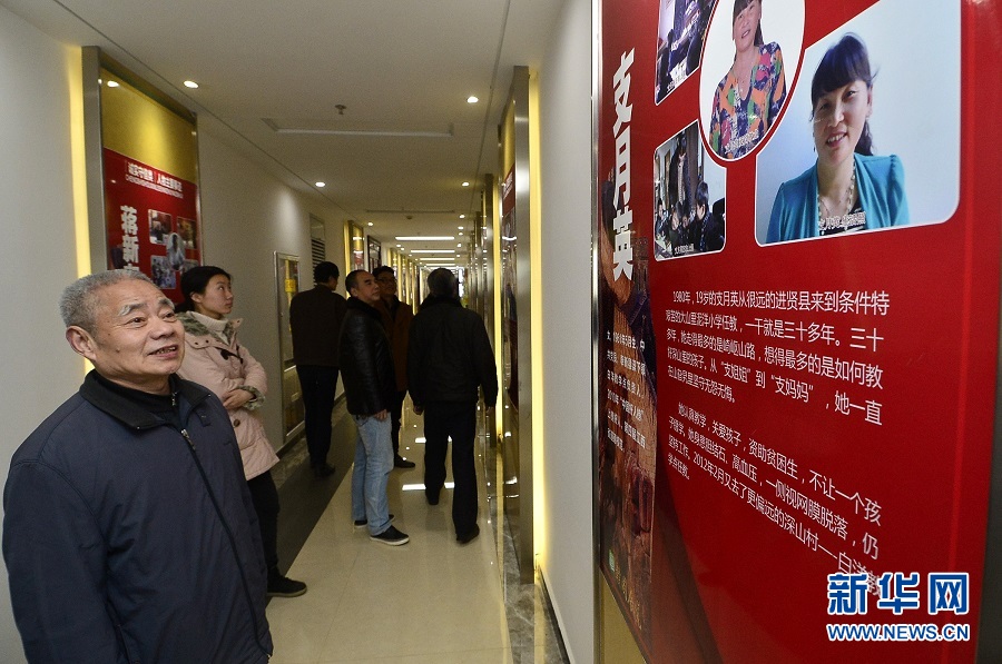市民在江西省南昌市東湖區(qū)圖書館參觀“德耀贛鄱”大型圖片巡展(2017年3月7日攝)。此次圖片展共收集、整理18位道德模范與“身邊好人”的先進事跡材料。新華社記者 彭昭之 攝