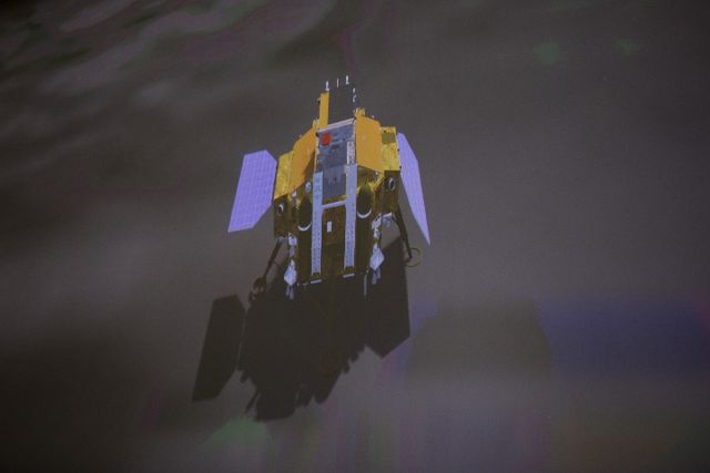 圖為1月3日在北京航天飛行控制中心拍攝的嫦娥四號(hào)探測器展開太陽翼(示意圖)。1月3日10時(shí)26分,嫦娥四號(hào)探測器自主著陸在月球背面南極-艾特肯盆地內(nèi)的馮·卡門撞擊坑內(nèi),實(shí)現(xiàn)人類探測器首次在月球背面軟著陸。新華社記者 金立旺 攝