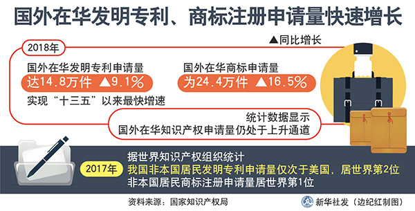 新華社北京1月11日電(記者張泉)記者10日從國家知識產(chǎn)權(quán)局獲悉,2018年,國外在華發(fā)明專利申請量、商標注冊申請量快速增長,國際社會對中國知識產(chǎn)權(quán)保護的信心持續(xù)增強。