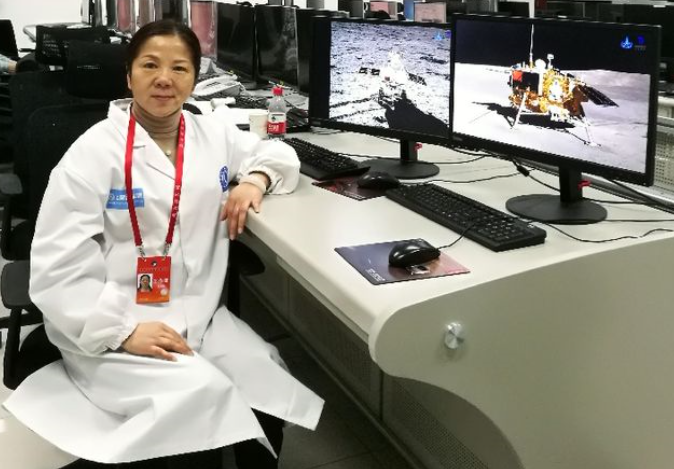 張玉花在嫦娥四號著陸器與月球車玉兔二號互拍后留影。航天科技集團八院供圖