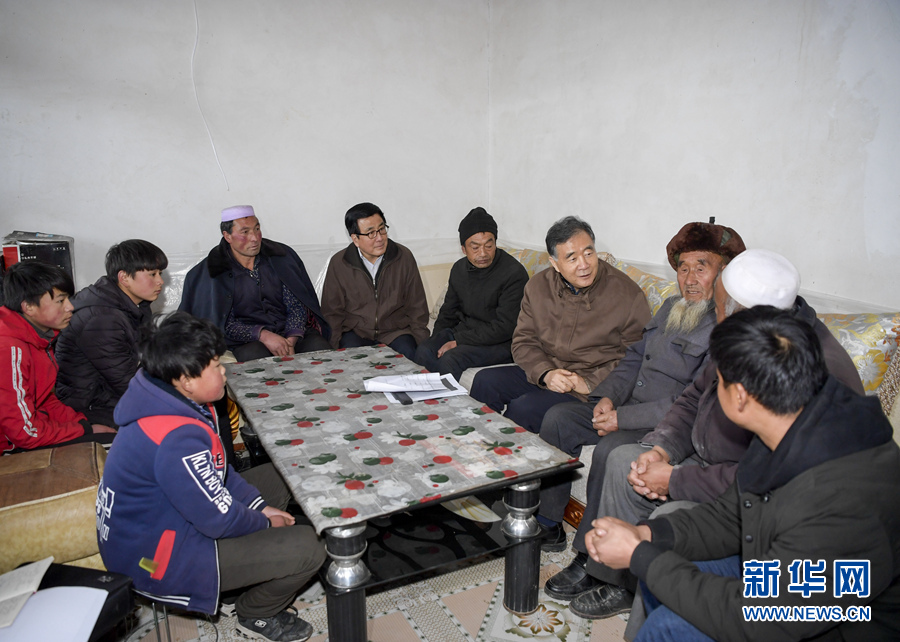 近日,中共中央政治局常委、全國政協主席汪洋在甘肅臨夏回族自治州調研脫貧攻堅工作,看望慰問貧困群眾和基層扶貧干部。這是1月13日,汪洋在積石山保安族東鄉族撒拉族自治縣劉集鄉肖家村看望慰問貧困戶。 新華社記者 李學仁 攝