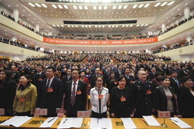 昨日,北京市第十五屆人民代表大會第二次會議開幕,全體起立唱國歌。當天,市人代會在北京會議中心召開,市長陳吉寧作政府工作報告。新京報記者 吳江 攝