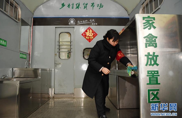 1月24日,乘務員清理8361次列車內上的貨架。新華社記者 張博文 攝