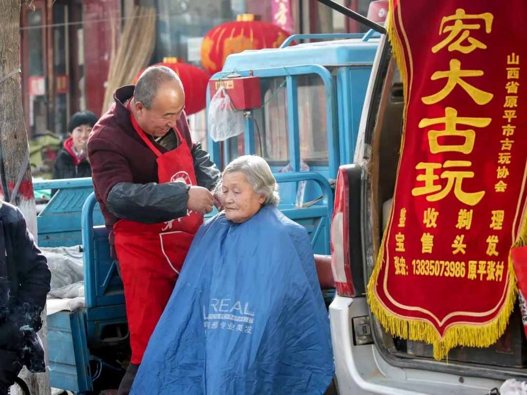 2019-01-28,山西省原平市子干鄉年集。有錢沒錢,理發過年。傳統年集,傳統年俗。不論男女,理發三元。作者:滹沱春郭