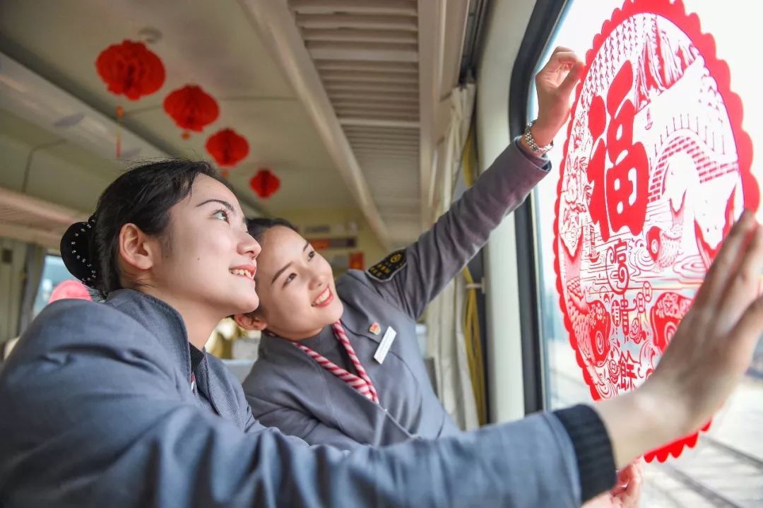 2019-01-29,江西省南昌市。南昌至北京西的Z68次列車上,乘務(wù)員在車上貼上窗花,為旅客準(zhǔn)備免費(fèi)書籍、玩具和春節(jié)物品等,營(yíng)造濃濃的年味兒。作者:清風(fēng)吹過(guò)60年