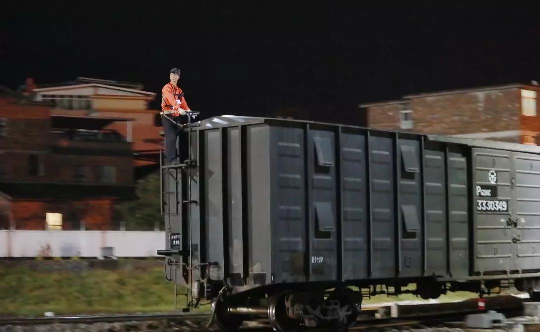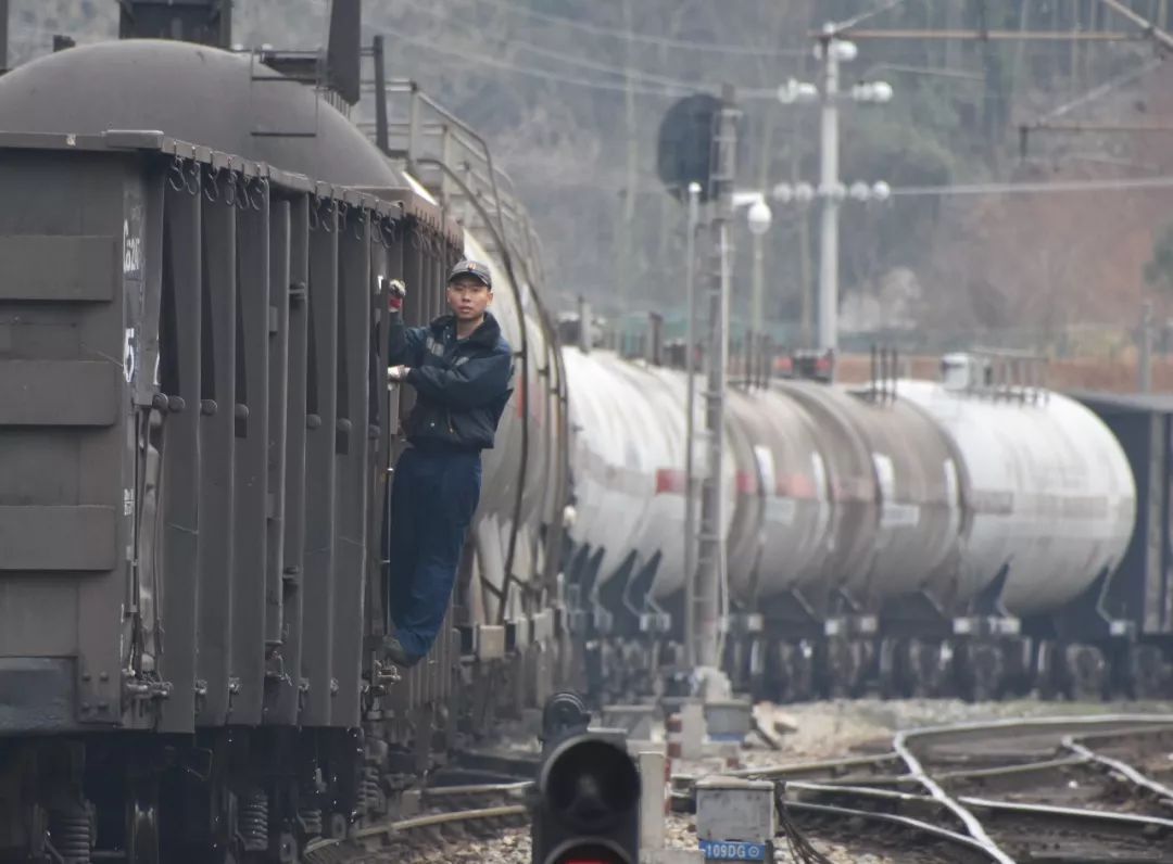 2019-02-02,長(zhǎng)沙車務(wù)段路口鋪車站。在搶運(yùn)航油、汽油等油品的專列上,連接員掛在車梯上編組列車。作者:麥子熟了