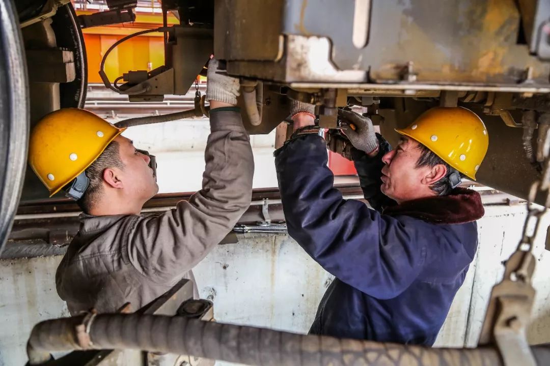 2019-02-08,唐山機(jī)務(wù)段。大年初四,唐山機(jī)務(wù)段的整備人員正在檢修機(jī)車走行部,確保出庫(kù)機(jī)車質(zhì)量良好。作者:樂(lè)亭閑人