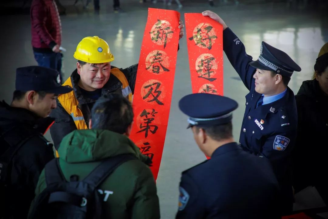 2019-01-21,河南省洛陽(yáng)市。為城市地鐵建設(shè)忙活一年的工人師傅也乘車回家過(guò)年,鐵路民警為其送上春聯(lián),希望他們新年越來(lái)越好。作者:陳國(guó)軍