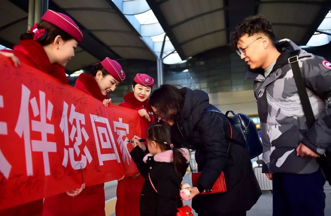 2019-02-03,天津西站。開車前,旅客與列車乘務(wù)人員在天津西站站臺(tái)上共同寫下新年祝福。作者:三木