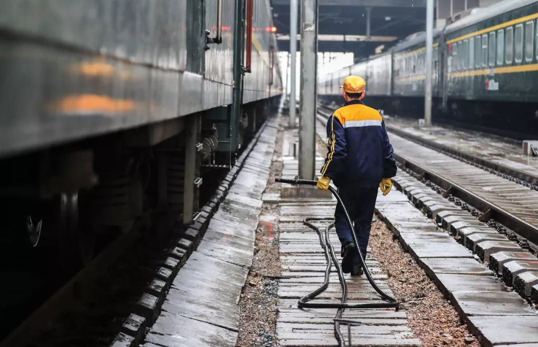 2019-01-11,天津。天津客運(yùn)段刷車工正在對(duì)車體進(jìn)行全面沖刷。作者:三生石