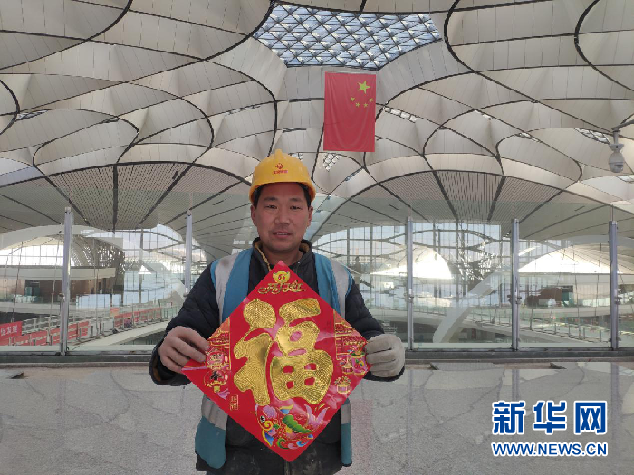 圖片說明:大興機(jī)場航站樓春節(jié)期間值守的工人舉起了“福”字。 攝影:新華網(wǎng)錢春弦
