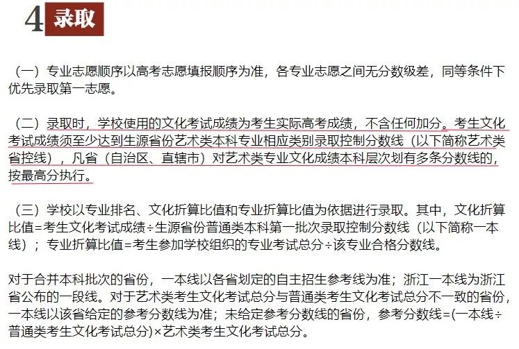 錄取時,文化課成績是門檻。依據錄取原則,專業考試合格的考生,文化課成績達到當地藝術類本科錄取最低控制分數線后,按專業成績從高到低排序,擇優錄取。