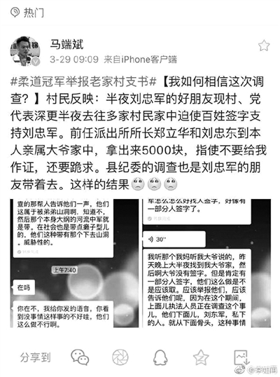 3月28日23時(shí)46分,舉報(bào)家鄉(xiāng)村官貪腐的柔道冠軍馬端斌通過(guò)個(gè)人實(shí)名認(rèn)證的微博發(fā)消息稱(chēng),其父親深夜被不明身份人員帶走,一時(shí)聯(lián)系不上父親,打電話一直沒(méi)人接,擔(dān)心其因?yàn)樽约号e報(bào)的事情被為難。