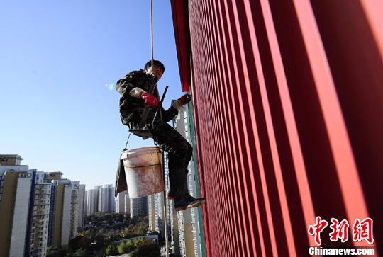 資料圖:一名外墻清洗工人在北京某住宅小區高空作業。中新社發 侯宇 攝