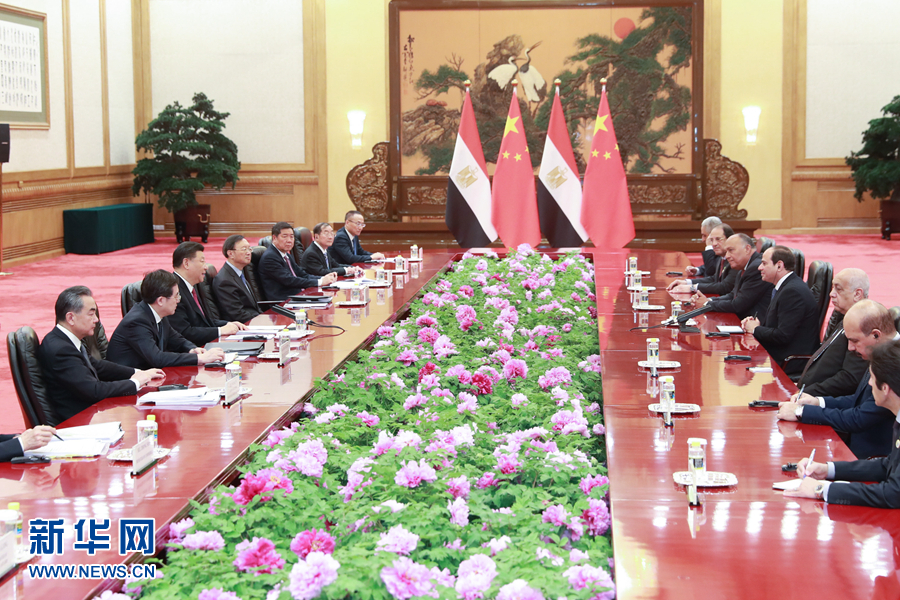 習(xí)近平強(qiáng)調(diào),埃及是非洲聯(lián)盟輪值主席國,總統(tǒng)先生來華出席第二屆“一帶一路”國際合作高峰論壇,不僅體現(xiàn)了埃及積極參與共建“一帶一路”的真誠意愿,也代表著非洲國家尋求互利共贏、實(shí)現(xiàn)共同發(fā)展的普遍呼聲。中方高度重視發(fā)展同埃及關(guān)系。雙方要深化政治互信,繼續(xù)在涉及彼此核心利益和重大關(guān)切問題上相互支持和配合。中方始終支持埃及探索符合本國國情的發(fā)展道路,愿積極參與蘇伊士運(yùn)河走廊開發(fā)計(jì)劃,持續(xù)推進(jìn)蘇伊士經(jīng)貿(mào)合作區(qū)建設(shè)及產(chǎn)能、基礎(chǔ)設(shè)施建設(shè)等領(lǐng)域合作。中方還將在埃及設(shè)立“魯班工坊”,向埃及青年提供職業(yè)技能培訓(xùn)。雙方要深化反恐和安全合作,持續(xù)密切人文交流。中國感謝非洲人民對中國的信任,我們支持非洲和平安全與可持續(xù)發(fā)展倡議和非洲一體化進(jìn)程,愿同埃方加強(qiáng)對非三方合作,共同促進(jìn)非洲基礎(chǔ)設(shè)施建設(shè)。
