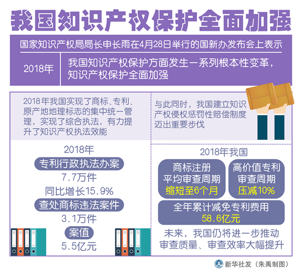 新華社北京4月28日電(記者張泉)國家知識產權局局長申長雨在28日舉行的國新辦發布會上表示,2018年,我國知識產權保護方面發生一系列根本性變革,知識產權保護全面加強。