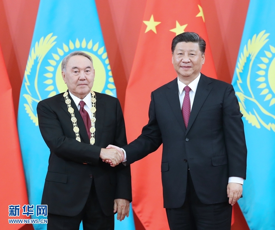 國歌畢,習近平發(fā)表講話。習近平說,今天,我們在這里舉行隆重儀式,向中國人民的老朋友、好朋友哈薩克斯坦首任總統(tǒng)納扎爾巴耶夫頒授中華人民共和國對外最高榮譽勛章“友誼勛章”。納扎爾巴耶夫首任總統(tǒng)是具有國際威望的政治家,也是中哈全面戰(zhàn)略伙伴關(guān)系的締造者和推動者。在他和中國領導人共同引領、推動下,中哈關(guān)系始終保持高水平運行,結(jié)出累累碩果。納扎爾巴耶夫首任總統(tǒng)以自己的遠見卓識推動上海合作組織和亞洲相互協(xié)作與信任措施會議蓬勃發(fā)展,為維護地區(qū)乃至世界和平穩(wěn)定作出了重要貢獻。