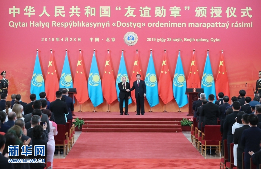4月28日,國家主席習近平在北京人民大會堂中央大廳為哈薩克斯坦首任總統(tǒng)納扎爾巴耶夫舉行“友誼勛章”頒授儀式。新華社記者 鞠鵬 攝