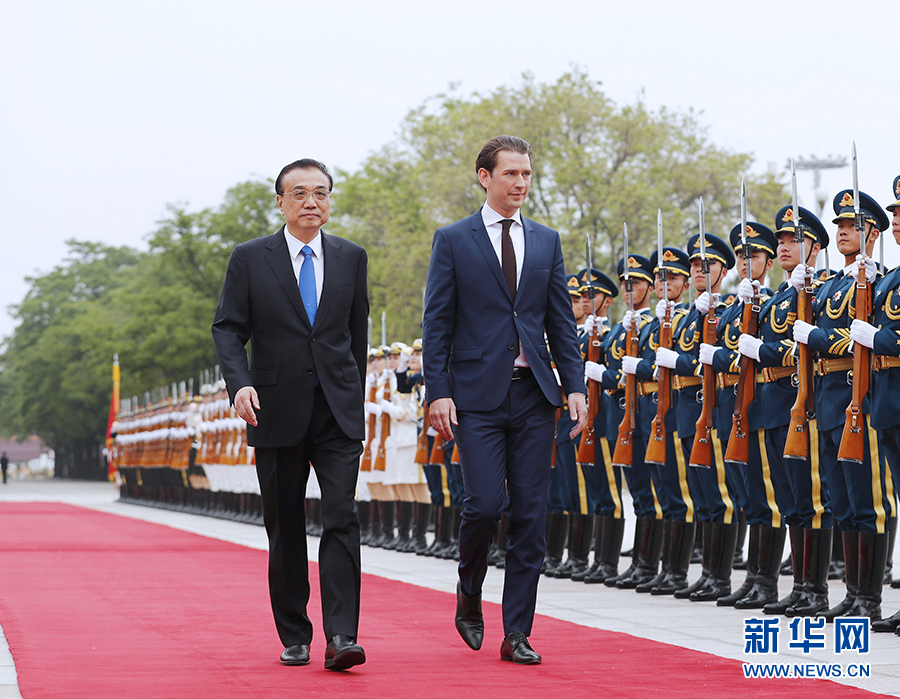 4月28日,國務(wù)院總理李克強在北京人民大會堂同奧地利總理庫爾茨舉行會談。這是會談前,李克強在人民大會堂東門外廣場為庫爾茨舉行歡迎儀式。新華社記者 劉彬 攝