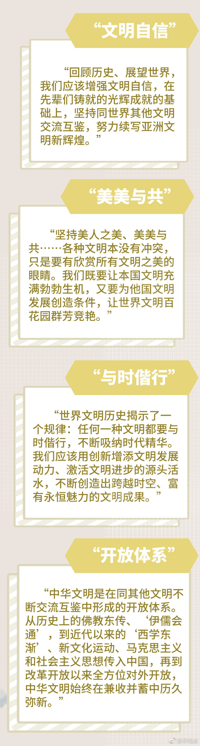 總結(jié)亞洲輝煌的文明成果,闡釋中華文明深刻內(nèi)涵,介紹不同文明“相處之道”,并提出亞洲人民三個期待和加強(qiáng)世界上不同國家、不同民族、不同文化交流互鑒的四點(diǎn)主張……