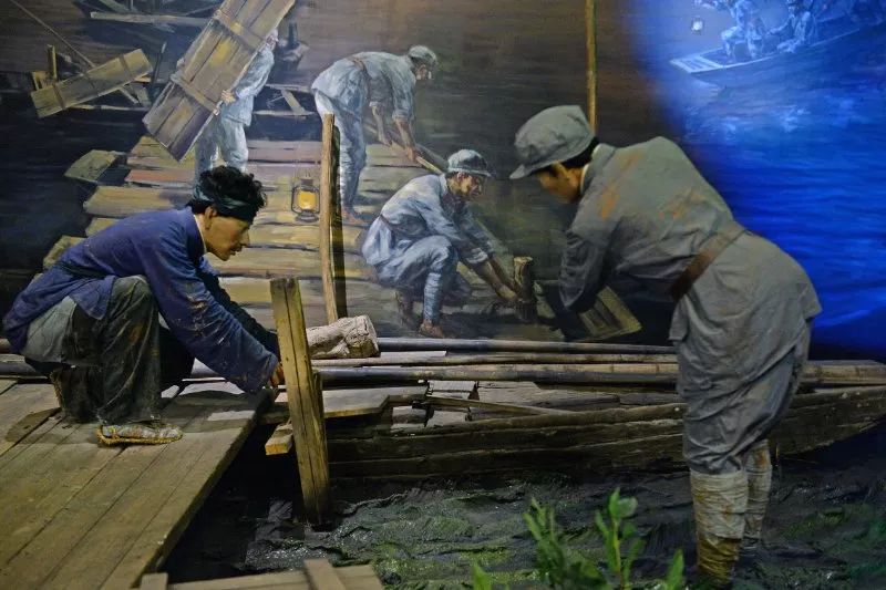 于都縣中央紅軍長征出發(fā)紀念館中蘇區(qū)群眾鋪設(shè)浮橋場景。新華社記者 萬象 攝