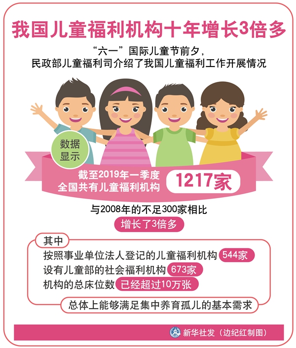 新華社北京5月31日電(記者羅爭光)“六一”國際兒童節前夕,民政部兒童福利司介紹了我國兒童福利工作開展情況。數據顯示,截至今年一季度,全國共有兒童福利機構1217家,與2008年的不足300家相比,增長了3倍多。
